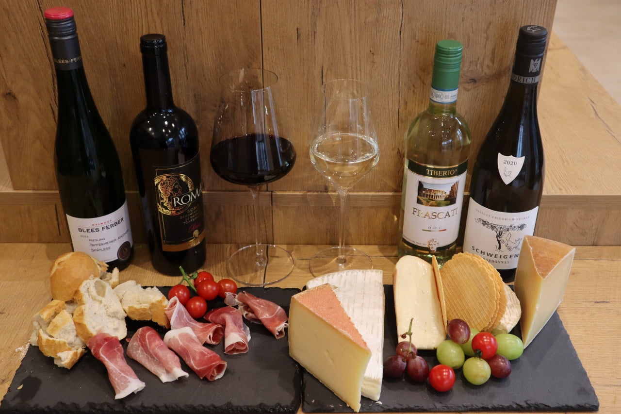 Weinbeginner (ab 2 Personen) 25€/Person : 5 Weine (2xWeiß,1xRose,2xRot) dazu Baguette, kleine Auswahl Antipasti. Optional: mit Käse und Serrano Schinken +10€/PP) - Dauer ca. 1h